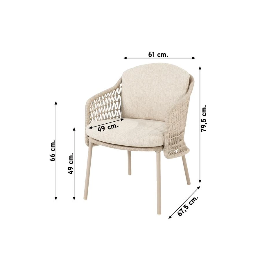 Deze prachtige Puccini tuinstoel van 4 Seasons Outdoor laat veel creativiteit zien. De latte kleur van deze stoelen zorgen voor een hele unieke uitstraling. Het RVS frame van deze stoel heeft een matte coating in deze kleur gekregen. Deze coating zorgt voor optimale weerbestendigheid zodat er nauwelijks tot geen onderhoud nodig is. Het rope heeft dezelfde kleur, zodat het een mooi geheel vormt samen. De ronde draden die gebruikt worden zijn voorzien van een kunststof kern. Het omhulsel van het touw wordt gemaakt van een weerbestendige stof, het voelt zacht aan en is waterafstotend, Uv-bestendig en kleurvast. Zo weet je zeker dat jij jarenlang kunt genieten van jouw Puccini tuinstoel! De kussen hebben een hoes van Olefin, een kleurvaste stof die Uv-bestendig is en waterafstotend. De kussens kunnen dus gewoon tegen een regenbuitje. Mochten ze vies zijn geworden, kan je ze makkelijk wassen op 30 graden middels de rits in de hoes.