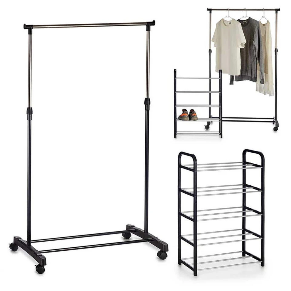 Kledingrek met bijpassend 4-laags schoenenrek van metaal. Het kledingrekje en het schoenenrekje bestaan beide uit zwarte en zilveren buizen. Formaat kledingrek: ca. 80 x 43 x 160 cm. Formaat schoenenrek: ca. 50 x 19 x 68 cm.