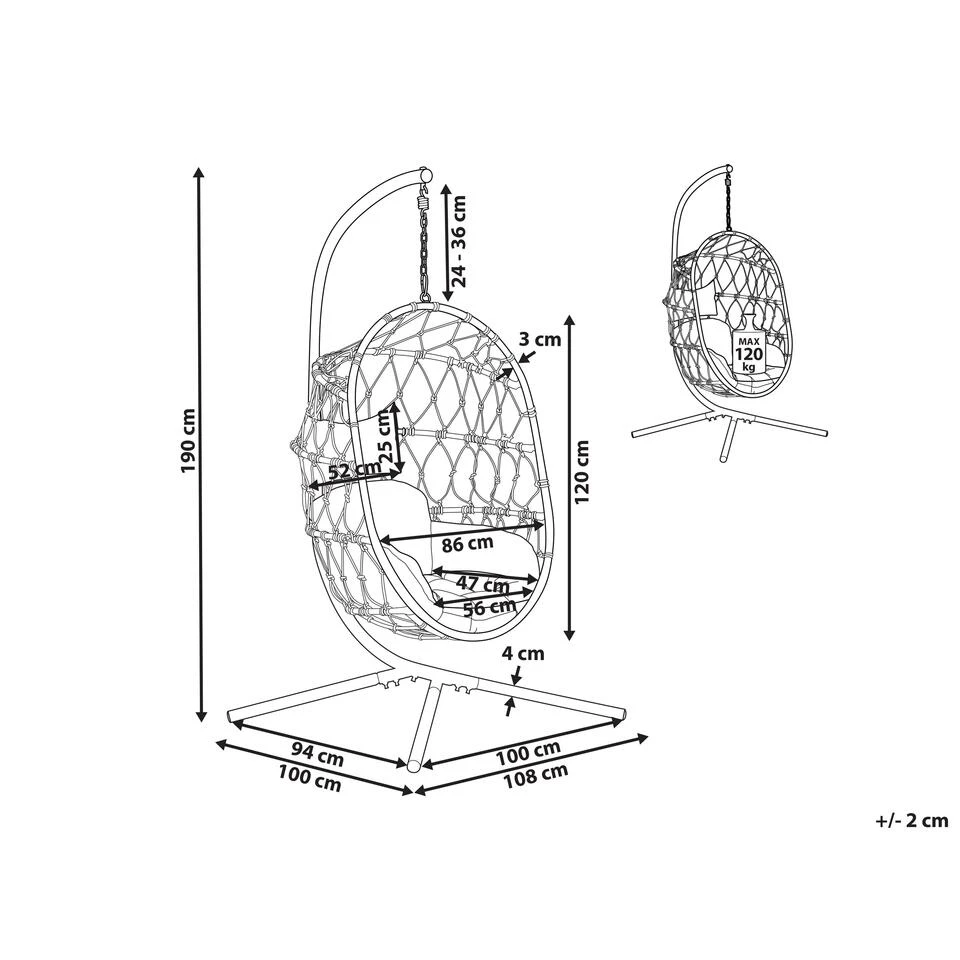 Schommelstoel ei-vorm met een zitkussen. Gun uzelf een plek om te ontspannen en waar je comfortabel kunt genieten van een nieuw boek met een kopje afternoontea. Deze hangende eierstoel kan dankzij het stijlvolle weven van de zitting en een minimalistische vorm een mooie aanvulling zijn op diverse interieurontwerpen. Dankzij de thermisch spuitafwerking die de weerstand en duurzaamheid van de gebruikte materialen verhoogt, kun je dit meubel bovendien niet alleen in je woon- of slaapkamer plaatsen, maar ook op het balkon of terras. De zachte wiegende beweging van het stuk en de dik gevoerde kussens helpen je te ontspannen na een stressvolle dag.