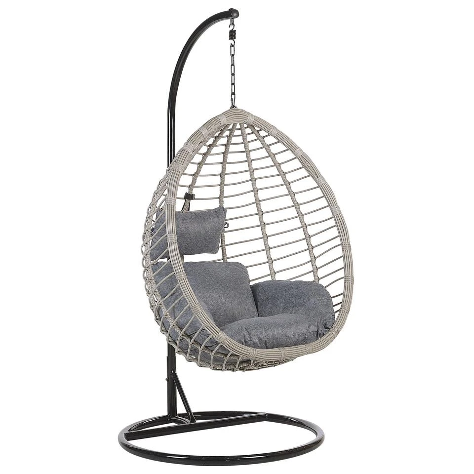 Rotan hangstoel in stevig zwart metalen frame inclusief kussens. In woonkamer, wintertuin of balkon – deze stijlvolle hangstoel van onderhoudsvriendelijk polyrotan heeft een stabiel stalen frame en kan daardoor overal geplaatst worden. De mand is stevig bevestigd via een ketting waardoor hij zachtjes wiegen. De twee comfortabele, stevige kussens zijn waterbestendig.