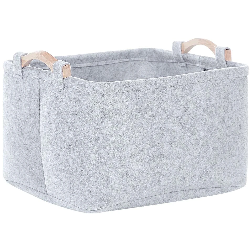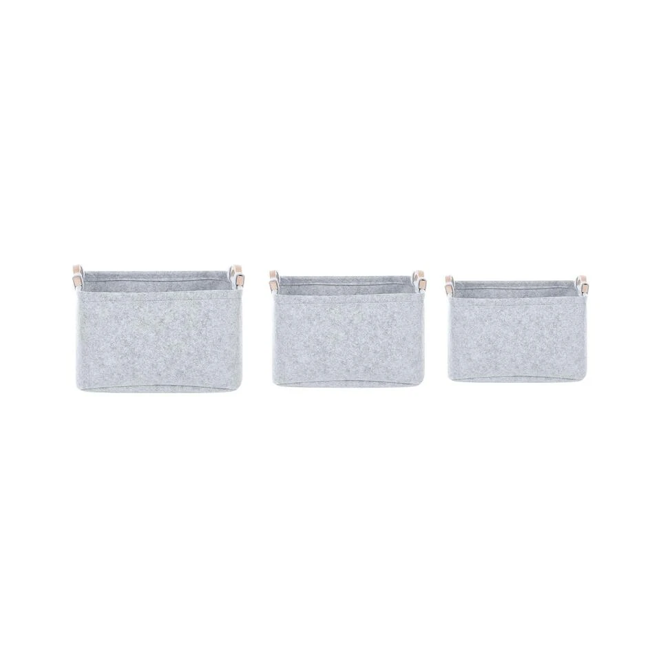 Handgemaakte opbergmandenset. Zorg ervoor dat je woonaccessoires en spullen overzichtelijk in een kledingkast of boekenkast staan met deze set van drie manden. De stukken zijn handgemaakt van hoogwaardig vilt, waardoor ze licht en zacht aanvoelen. Dankzij de houten handvaten verplaats je de manden gemakkelijk en door de drie verschillende formaten kun je ze op meerdere manieren gebruiken.