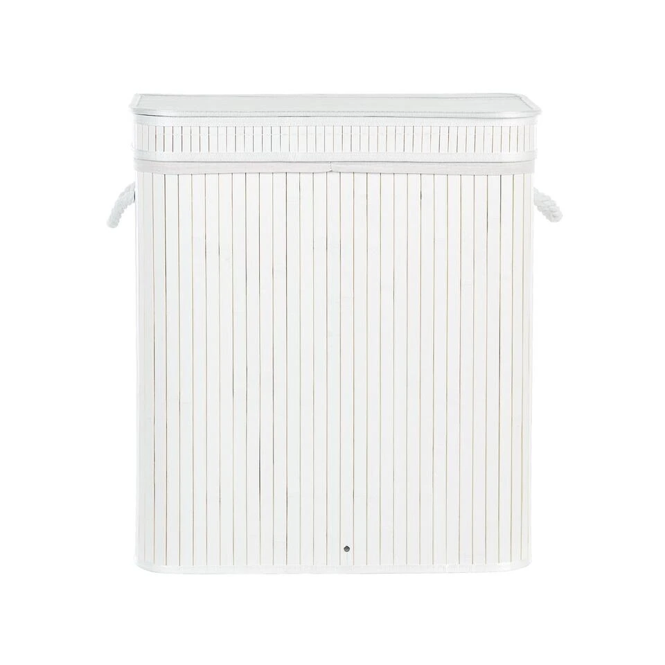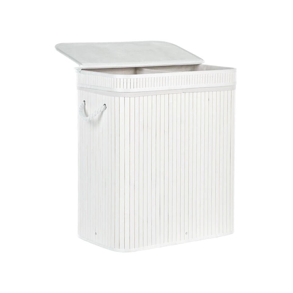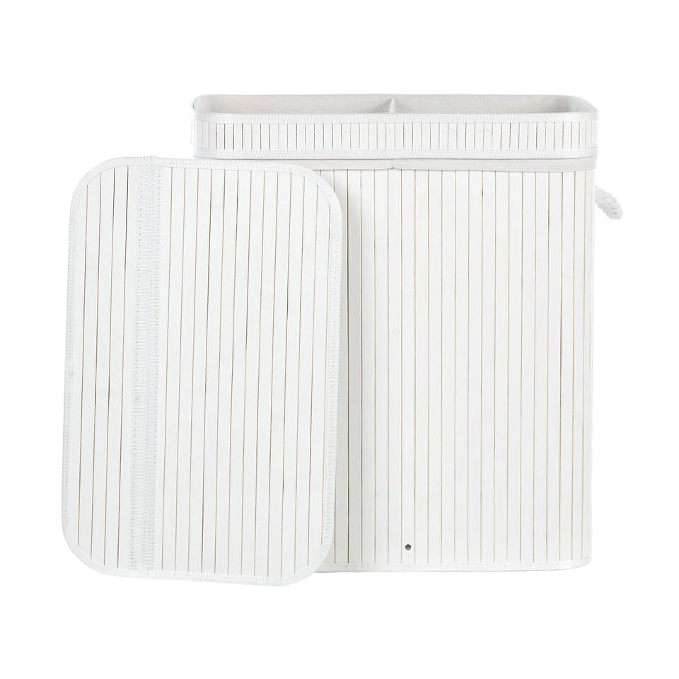 Bamboe wasmand met 2 vakken. Vind een perfecte plek voor je wasgoed, handdoeken of beddengoed in deze hoge mand. Hij is gemaakt van bamboe in een lichte tint en biedt voldoende opbergruimte voor alles wat je nodig hebt om te verbergen. De mand wordt geleverd met een deksel met ritssluiting voor handig gebruik en een wasbare binnenzak met twee compartimenten. Door het natuurlijke materiaal past het naadloos in elke moderne badkamer, slaapkamer of wasruimte.
