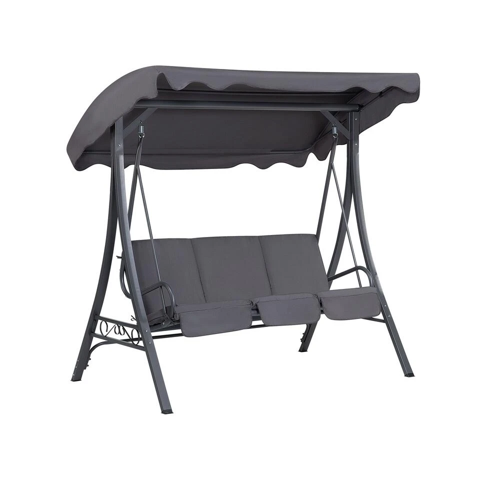 Stijlvolle en comfortabele schommelbank. Deze schommelbank is uiterst comfortabel! Omdat hij een extra zachte vulling heeft, is het een genot om in te zitten. De stoffen bekleding, die goed harmonieert met het zonnedak, kan goed worden gecombineerd en is bijzonder effectief in je tuin. Het frame is gemaakt van staal en is zeer gemakkelijk te verzorgen, weerbestendig en stabiel. Dit charmante tuinelement heeft een kalmerend effect, met dit model staat niets een mooie zomer in de weg.
