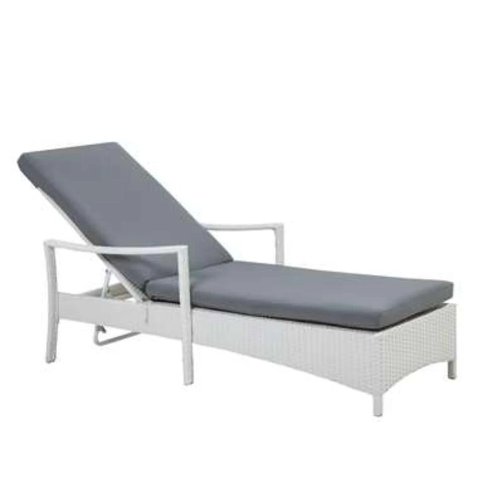 Witte wicker ligbed. Deze rotan ligstoel is van hoge kwaliteit en zal je tuin, balkon of terras zeker verbeteren. Hij past perfect bij moderne en hedendaagse stijlen. Gemaakt met hoogwaardig rotan materiaal is hij ontzettend duurzaam en kan hij allerlei weersomstandigheden en langdurig gebruik makkelijk aan. Het stevige frame en de comfortabele met foam gevulde kussens bieden ultiem comfort terwijl de verstelbare rugleuning gemakkelijk aan je wensen aan te passen is.