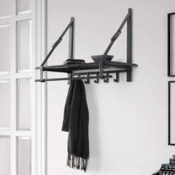Functionele kapstok voorzien van 8 haken, tevens voorzien van een roede voor kleding hangers en een legplank van gaas om kledingstukken (of accessoires) op te leggen. De kleur van deze kapstok is niet zwart maar donker grijs (RAL 7016).