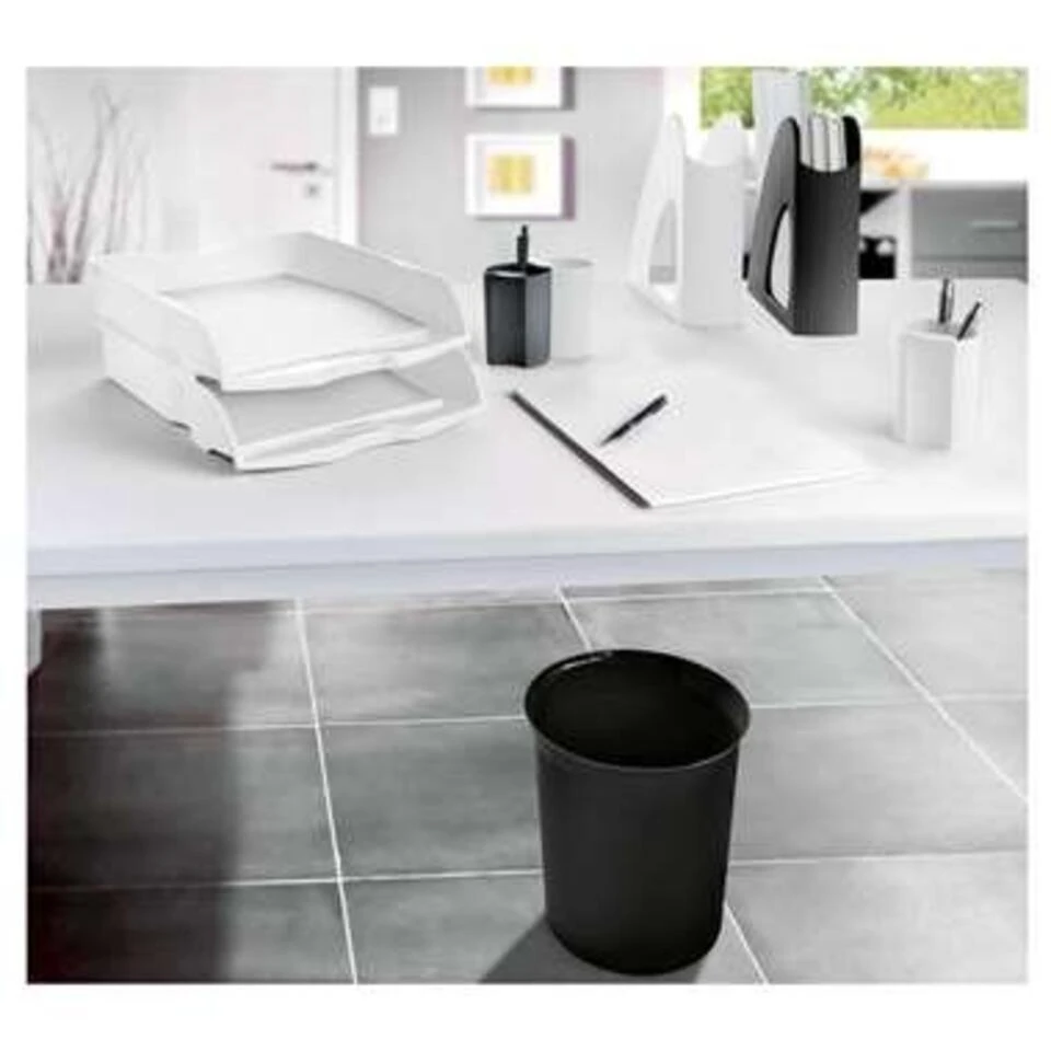 Een zwarte papierbak/vuilnisbak/prullenbak, met een inhoud van 13 liter. Doorsnede boven/onder: 288/226 mm. Hoogte: 287 mm. Materiaal: kunststof. Kantoorartikelen/kantooraccessoires.