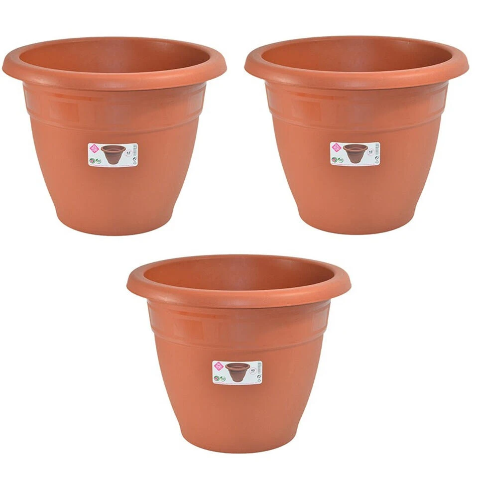 Terra cotta kleur ronde plantenpot/bloempot kunststof diameter 45 cm. Plantenpot met decoratief randje. Deze pot is gemaakt van kunststof, en kan daardoor tegen een stootje/is niet breekbaar. De pot wordt geleverd zonder gaatjes in de bodem, deze kunt u eventueel zelf boren zodat overtollig water kan weglopen. Bij gebruik op een tafel wordt een onderschaal/onderbord aangeraden indien u gaatjes in de pot heeft geboord.