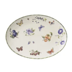 Deze schaal is onderdeel van het Fruit amp Flowers-servies van Janneke Brinkman-Salentijn. Haar kleurrijke en natuurgetrouwe illustraties zijn zo prachtig geschilderd, dat het bijna zonde is om het ovale schaaltje te gebruiken. We begrijpen het daarom volkomen als je deze gewoon als eyecatcher in je servieskast zet.