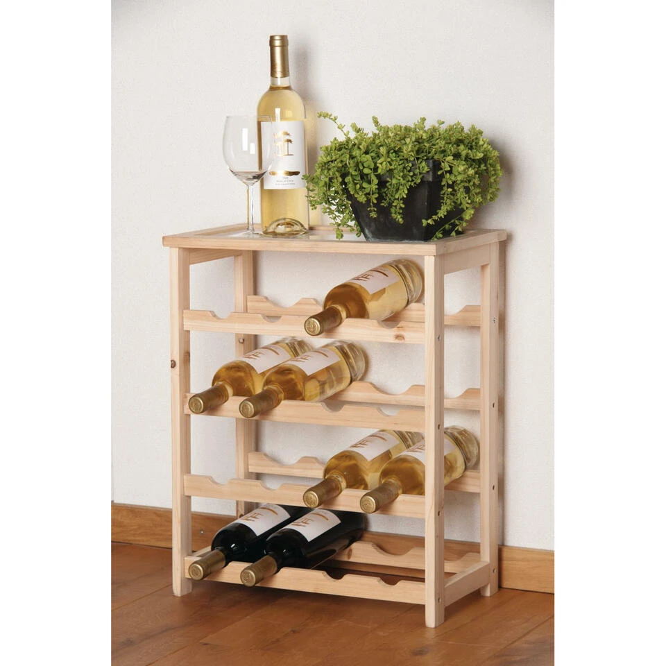 Een wijnrek/wijnflessenrek/wijnkist, met ruimte voor 16 flessen. Het rek heeft een blad/plank/tafeltje aan de bovenkant zodat u er bijvoorbeeld glazen op kunt zetten. Afmeting: circa L46 x B23 x H55 cm. Materiaal: hout.
