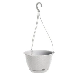 Hangende plantenpot/bloempot kunststof dia 22 cm/hoogte 14 cm parel wit. Geschikt voor buiten. Vorstbestendig ja. Plantenpotten voor in de tuin of balkon. Rotan gevlochten bloempotten met kunststof ophanghaak