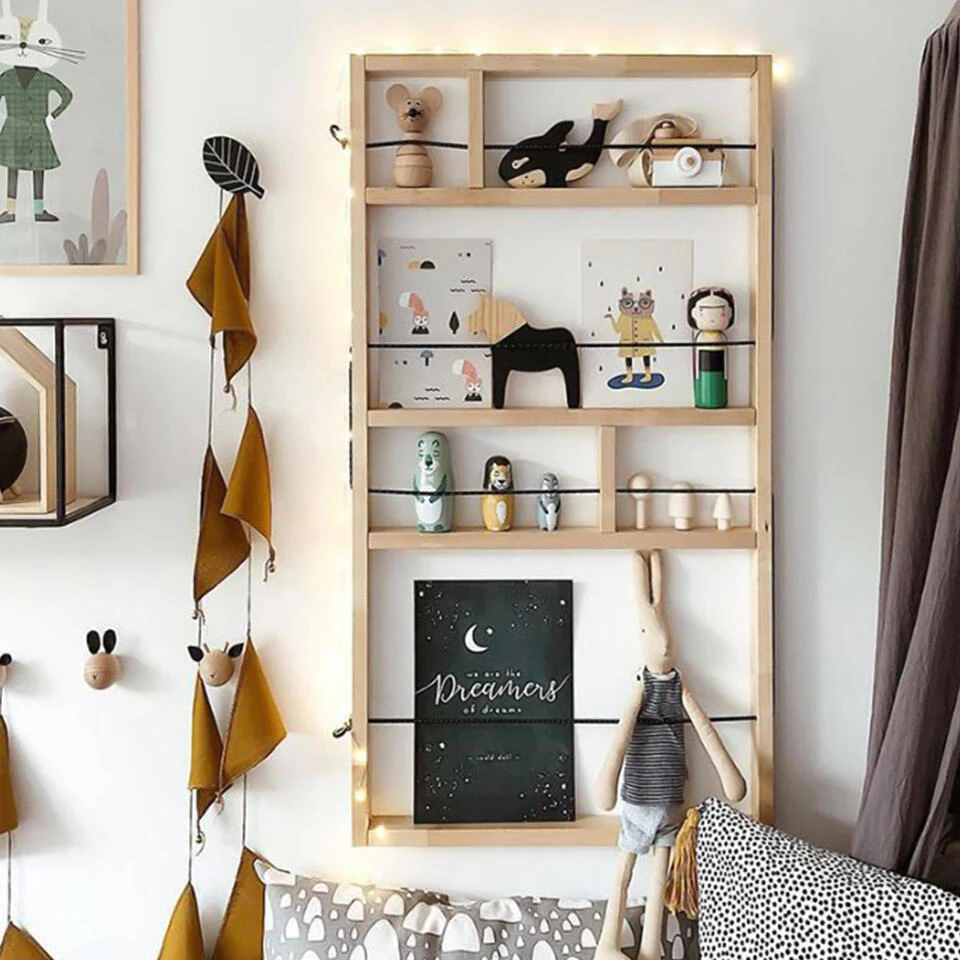 Ben je op zoek naar een minimalistisch en handig item voor in je woonkamer? Een wandrek met elastiek is een leuke toevoeging aan het interieur. Je kunt dit wandrek met vakken gebruiken om te vullen met mooie accessoires of om bijvoorbeeld te gebruiken in een kinderkamer en er speelgoed in te bewaren, met daartussen een aantal leuke posters of knuffels. Je voegt extra sfeer toe door bijvoorbeeld een lichtsnoer om het wandrek met elastiek te hangen. Het rek is gemaakt van lichtbruin hout en heeft zes verschillende vakken.
