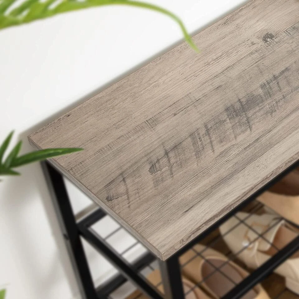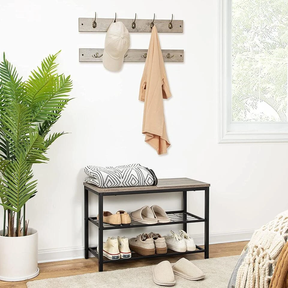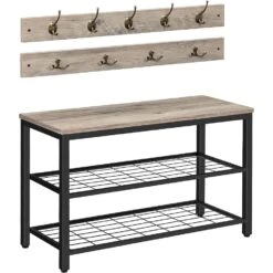 Het bijbehorende schoenenrek heeft een afmeting van 70 x 30 x 46 cm en beschikt over twee rasterplanken. Dit biedt voldoende ruimte om verschillende paren schoenen netjes op te bergen. De bovenkant is ook gemaakt van gefineerd spaanplaat met dezelfde grijskleurige houtkleur, waardoor het perfect bij de kapstokken past. Deze kapstokset is perfect voor mensen die op zoek zijn naar een eenvoudige, maar stijlvolle oplossing voor het organiseren van hun hal. Het biedt voldoende ruimte om jassen, tassen en schoenen netjes op te bergen en het mooie design past in vrijwel ieder interieur.