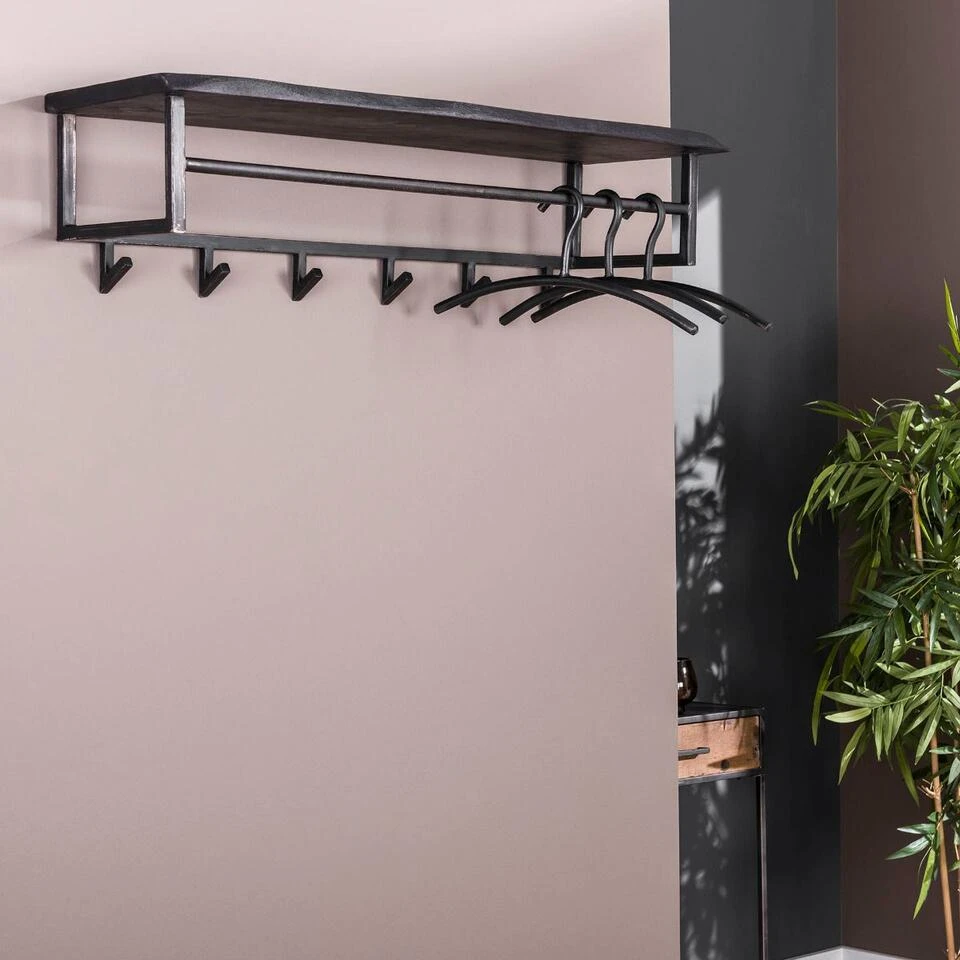 Deze kapstok ‘Yucon’ is voorzien van een hoedenplank gemaakt van massief acacia hout. Zorgvuldig geselecteerd hout, voorzien van een fijne nerf en diverse noesten, die op ambachtelijke wijze wordt verwerkt met een zwarte finish. Dit zorgt voor een natuurlijke én unieke look aan de wand. Aan de hoedenplank is een geschuurde metalen roede bevestigd en zijn er 6 haakjes aanwezig. Er kunnen dus zowel jassen aan een haakje als aan een hanger worden opgehangen. De kapstok is voorzien van twee bevestigingsogen aan de achterzijde, zodat de kapstok eenvoudig aan de wand kan worden gemonteerd. Bevestigingsmateriaal wordt niet meegeleverd omdat iedere wand vraagt om ander materiaal. Deze kapstok komt uit de Yucon-serie, welke verder bestaat uit een eettafel ovaal, eettafel rond, een bijzettafel, een ladekast en een nachtkastje. Combineer de diverse meubels voor eenheid binnen het interieur.